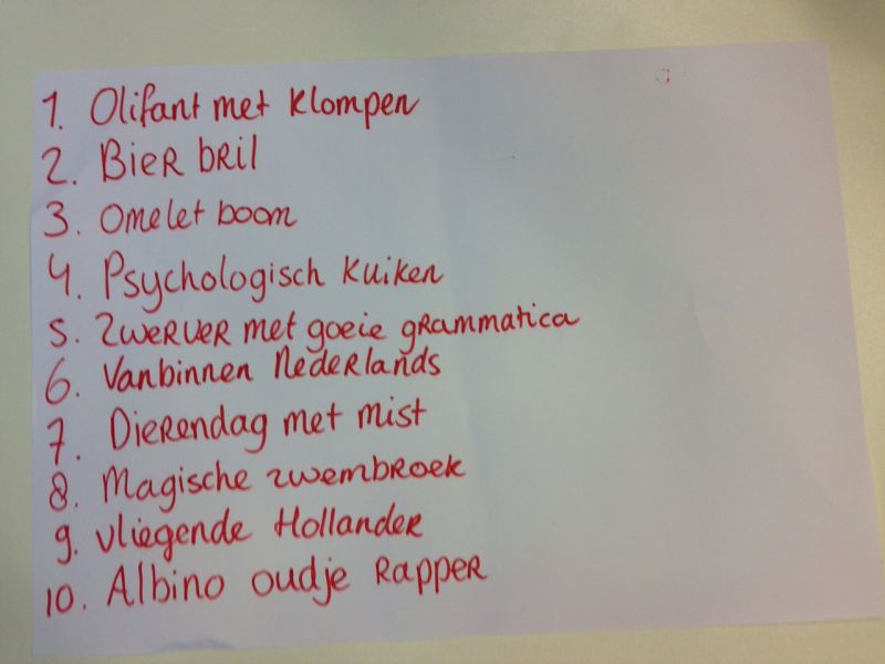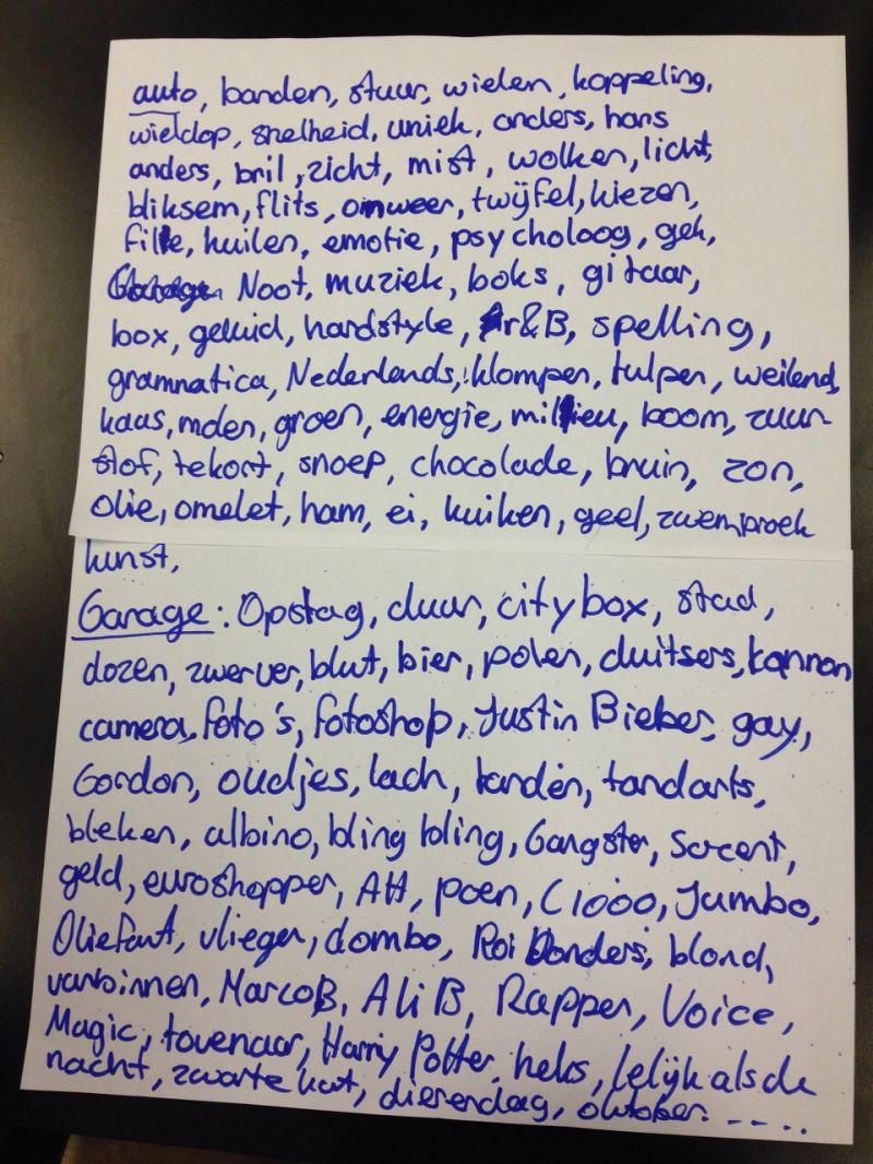 Foto 1: We begonnen met het woord 'auto' en 'garage'. Onze creatieve geest deed verder het werk. Telkens dachten we aan een woord dat er bij hoorde en zo gingen we van auto, naar muziekgenres, naar supermarken tot Harry Potter.