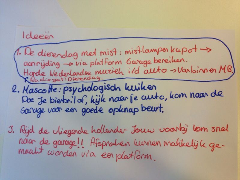 Op school heb ik meerdere creatieve sessies gedaan om mijn niveau te verbeteren. Het eerste voorbeeld is een creatieve brainsessie die uiteindelijk moest leiden tot een reclamespotje voor BesteGarage.nl. Deze sessie hebben we gedaan gedurende de professionele vaardigheden lessen. Samen met Laurens, Elisa, Hermela, en Manouk zaten we in een groepje.